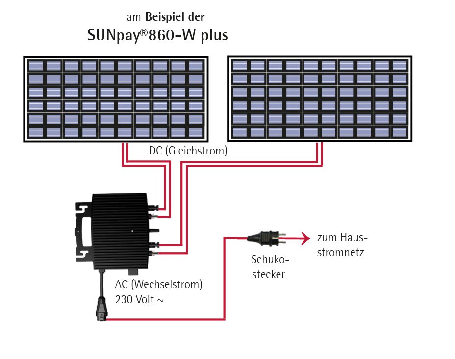 - Mittels des Wechselrichters wird der erzeugte Strom über die nächstgelegene Steckdose/Abzweigdose in das Hausstromnetz eingespeist.